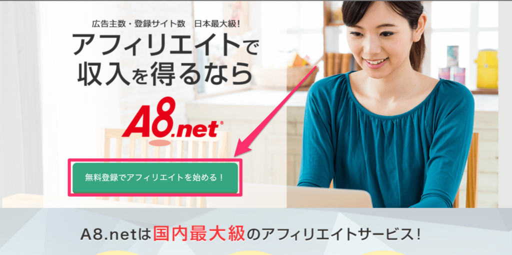 まずトップページに表示されている「無料登録でアフィリエイトを始める!」というボタンをクリックしてください。