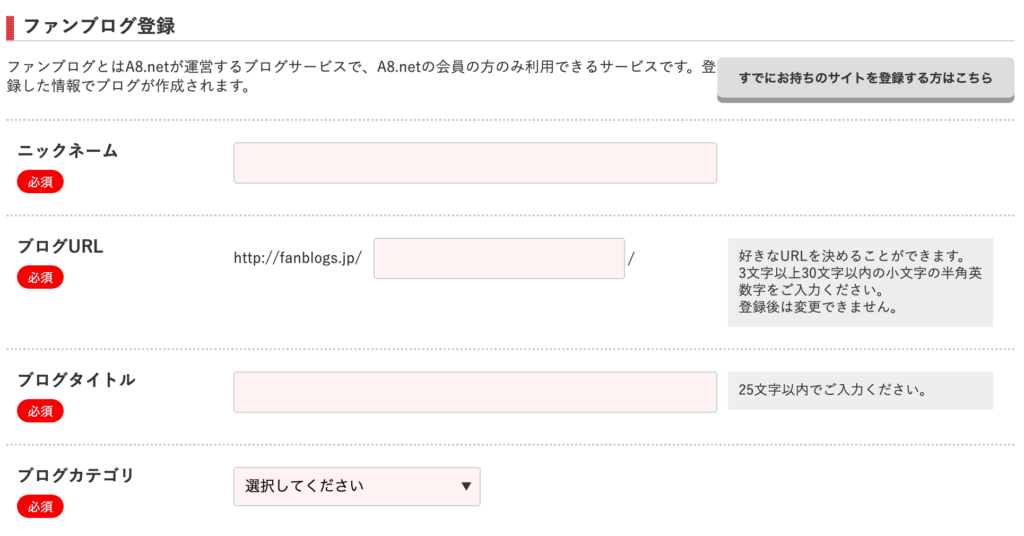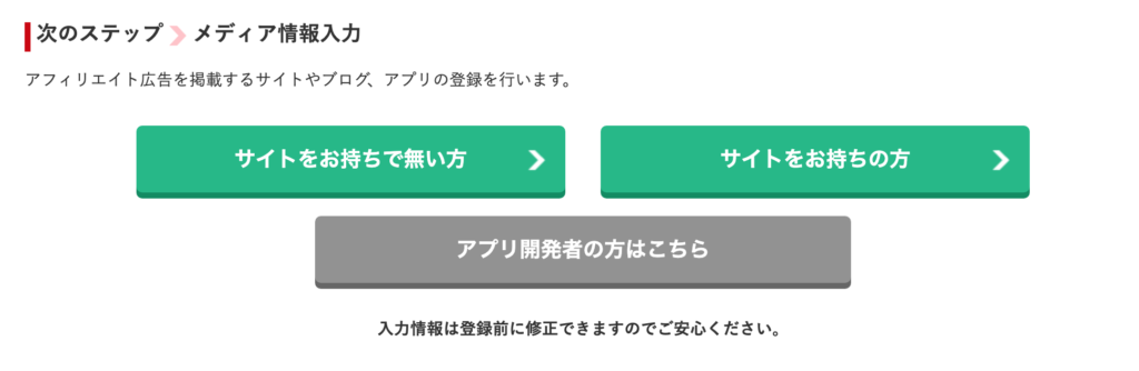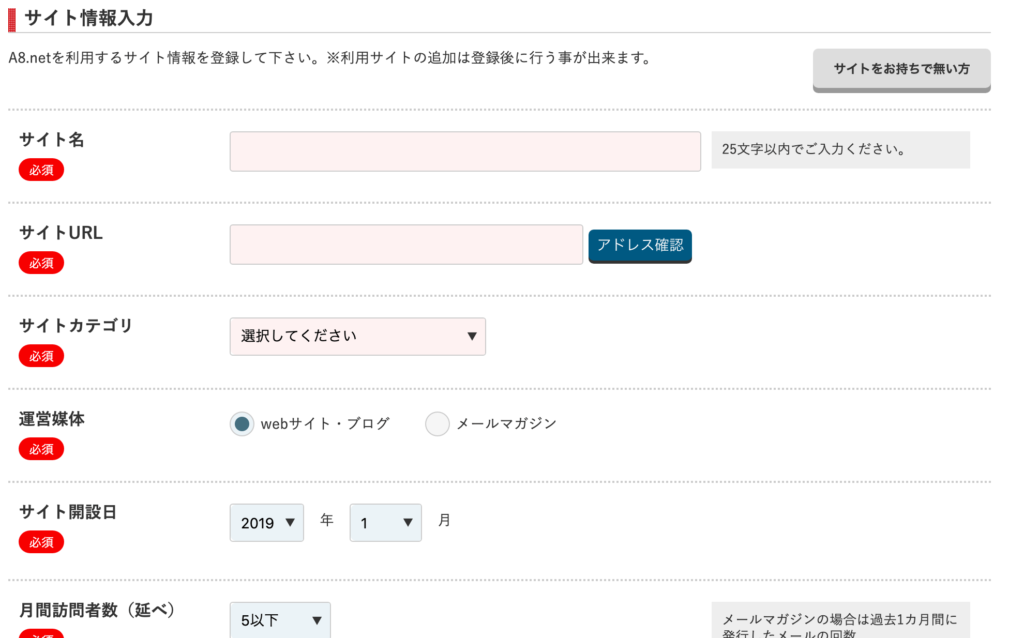 自分のサイトやブログをすでに持っている方は「サイトをお持ちの方」を、それ以外の方は「サイトをお持ちでない方」をクリック。