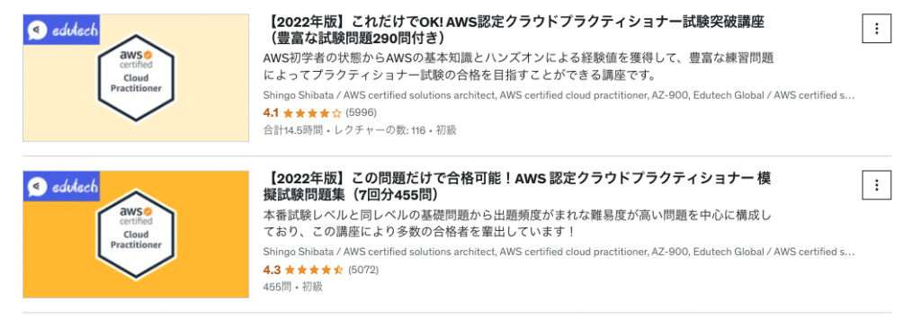 - udemy:【2022年版】この問題だけで合格可能!AWS 認定クラウドプラクティショナー 模擬試験問題集(7回分455問)