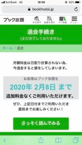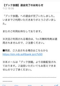 メールアドレスを登録されている場合は「【ブック放題】退会完了のお知らせ」というメールが届いているはずなので、ご確認ください。