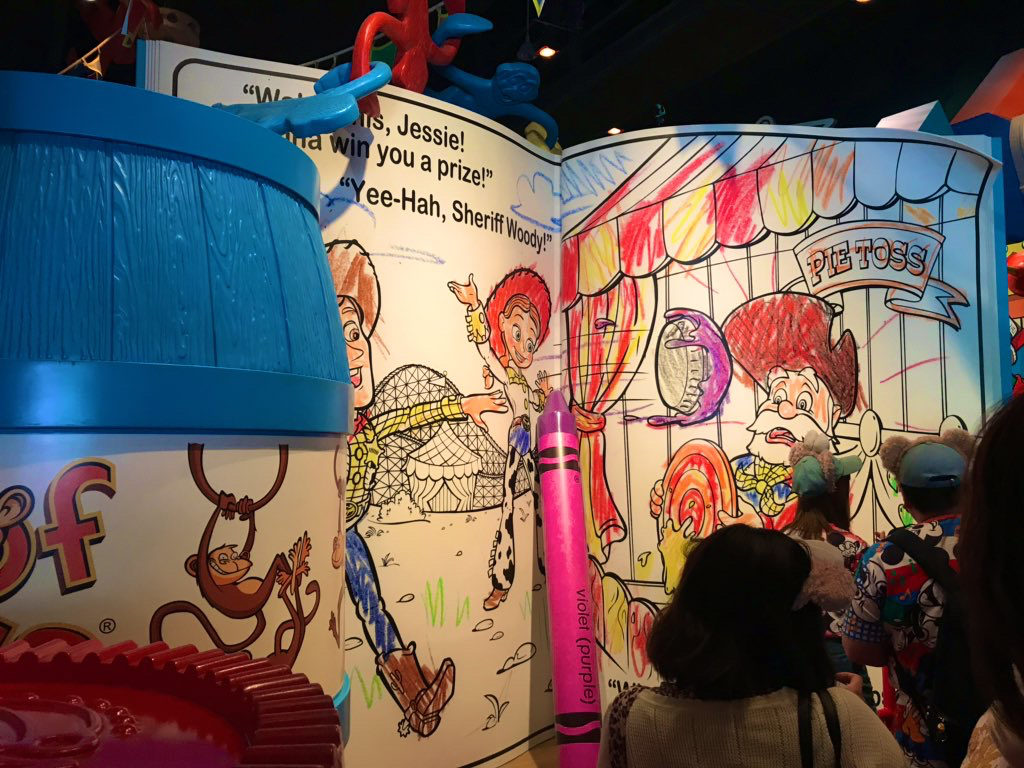 自分がおもちゃの大きさになって、ウッディたちの世界に入っていくアトラクションです。