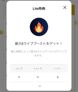 また、プレミアムではライブブーストが最大60ですが、Liteでは最大6しかもらえません。