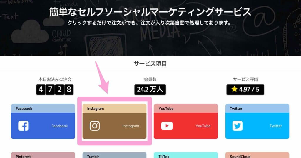 会員登録を済ました後にトップページから、枠線で囲まれた「instagram」をクリックします。