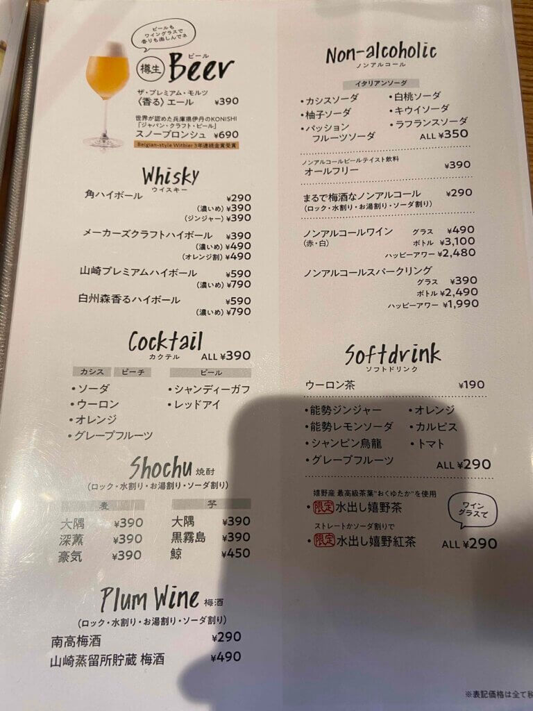 お酒のメニューはこんな感じで、他にもワインやジンベースのお酒がいくつかありました。