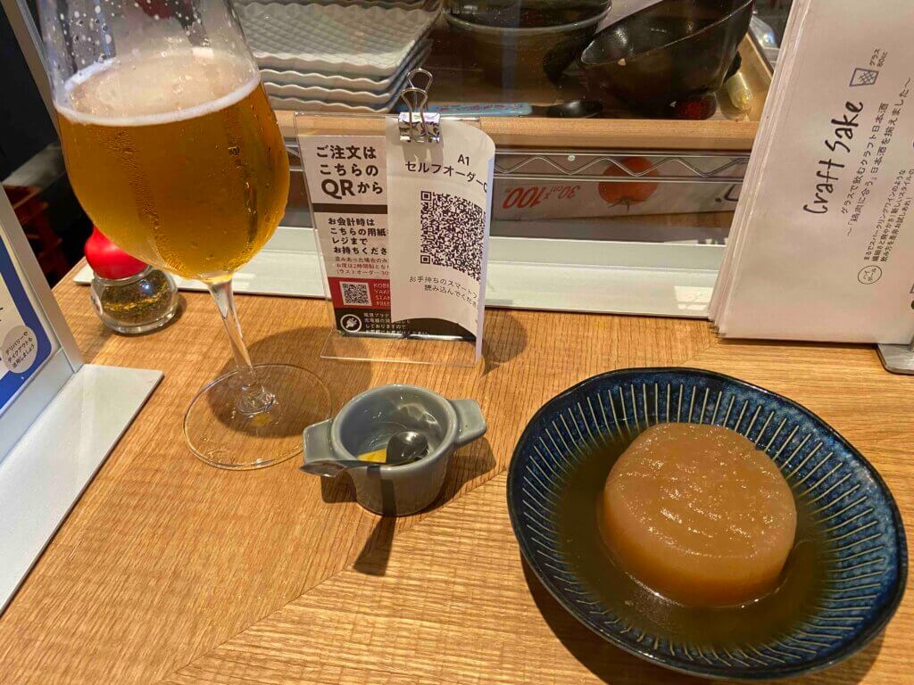 まず1杯目は生ビール(香るエール)で、おでんの大根と共にいただきます。