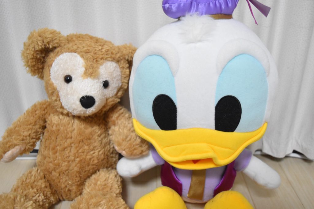 ドナルドは、ディズニーシーの「アブーズバザール」という場所のミニゲームをクリアすると、非売品のぬいぐるみをゲットできるところがあるんですけど、そこでゲットしました!