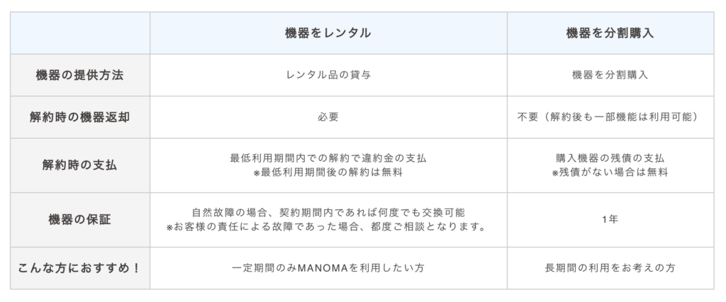 MANOMAの料金は、「レンタルする場合」と「機器を分割購入する場合」とに分かれます。