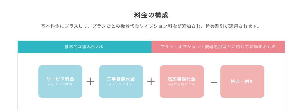 | 3~37ヶ月目 | 8,948円(税込) | 月額基本料金 3,938円(税込) 機器料金(割賦) 4,500円(税込) 工事費(割賦) 510円(税込) |