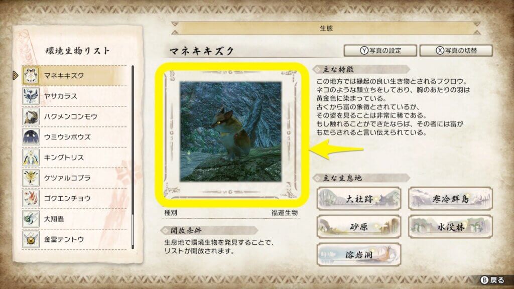 中でもヤサガラスとマネキキズクはマップ上に表示されず、出会えることは稀なので私もかなり見つけるまで時間がかかりました。