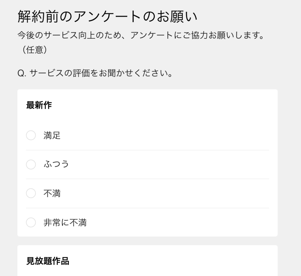 最後に退会前のアンケートを回答してほしいという画面が表示されるので、そこは各自の判断に任せます。