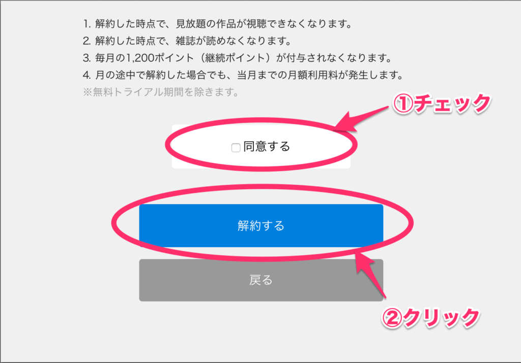 1番下までスクロールして「同意する」項目をチェックした後に、「解約する」ボタンをクリックして下さい。