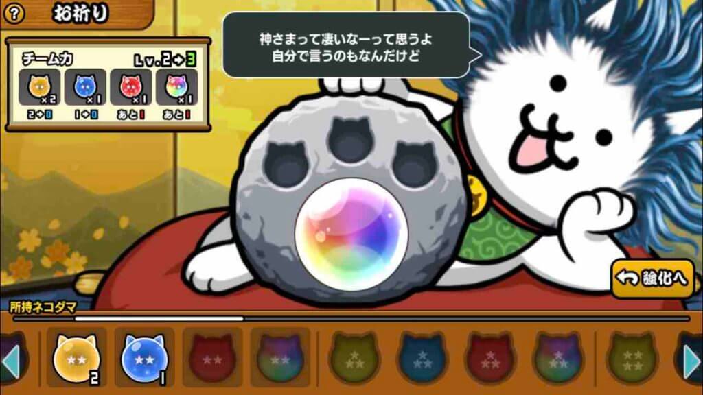 ネコダマというのは「チーム力」や「食料庫拡張」などの強化に用いるアイテムのようなもので、中心に描かれた星の数でレア度が変わります。
