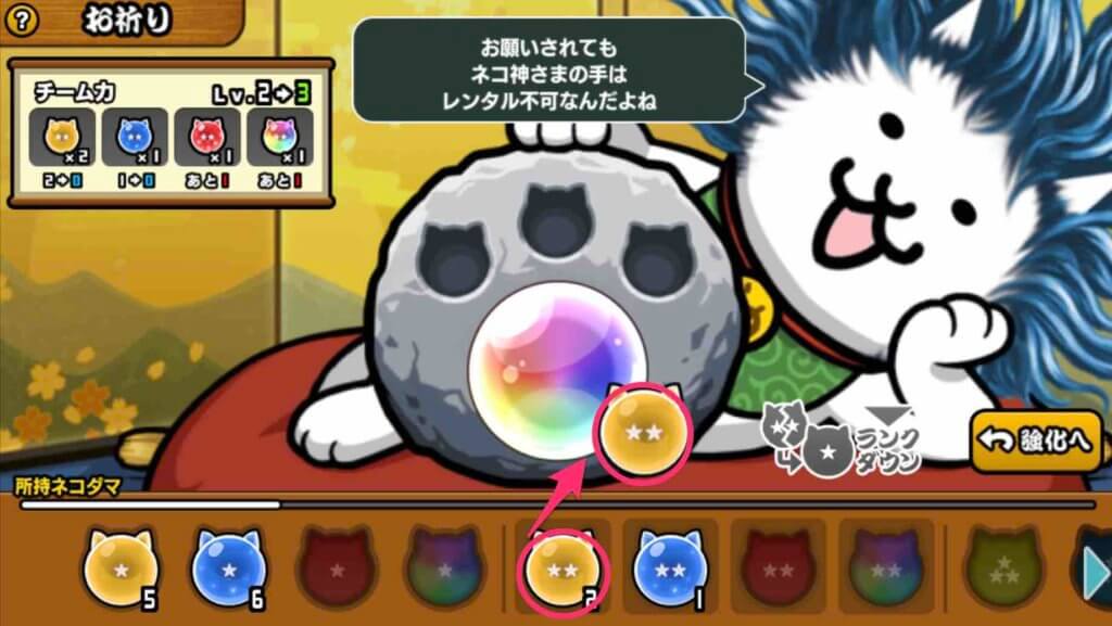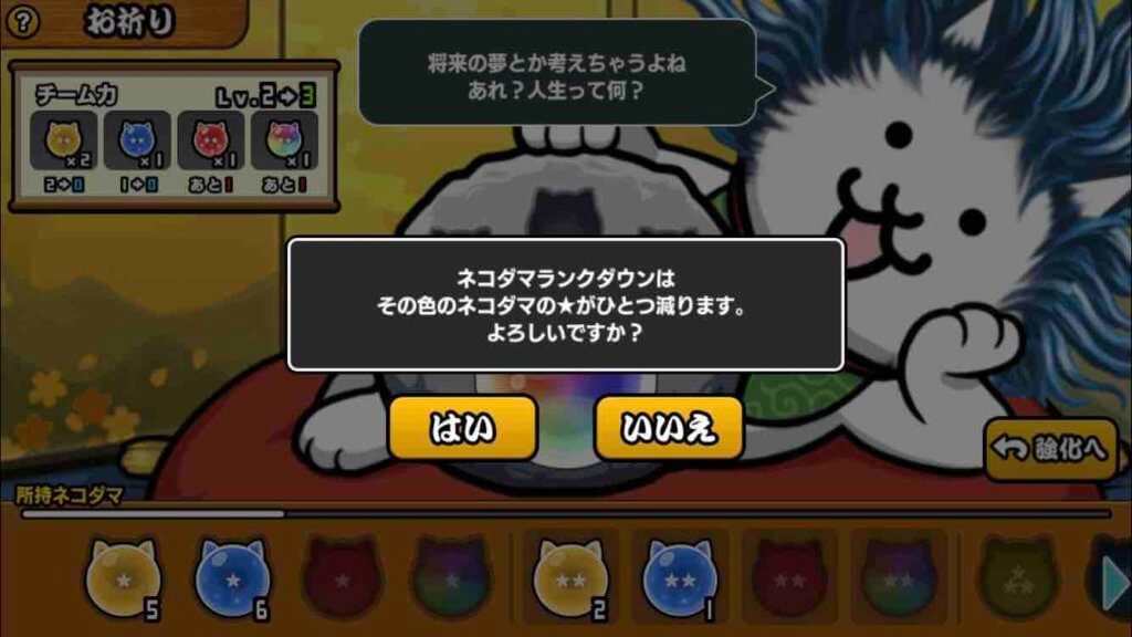 すると「ネコダマランクダウンはその色のネコダマの星がひとつ減ります。よろしいですか?」と出るので、「はい」を押せば完了です。
