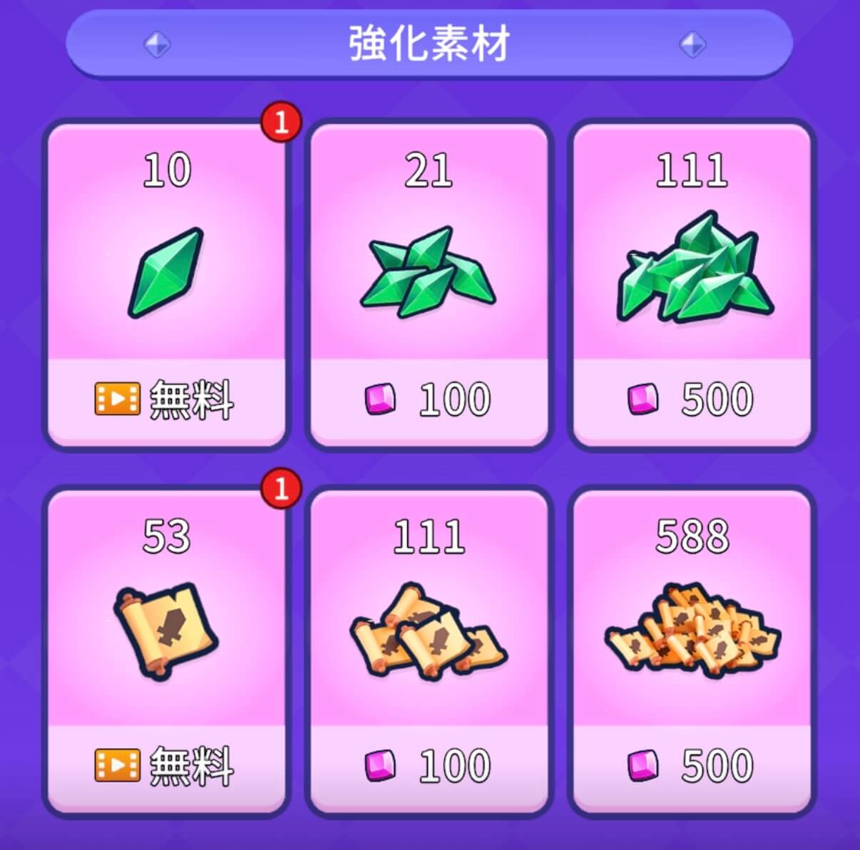 広告を視聴することで、まとまったアイテムが手に入り、敵を倒しても手に入りにくいジェムなんかも入手可能です。