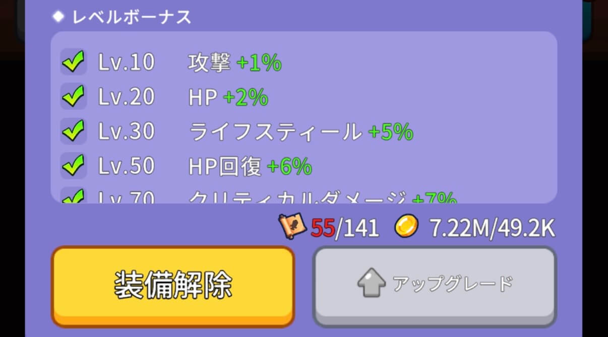 武器スロットの解放やステータス強化、広告報酬で得られるアイテム数の増加など。